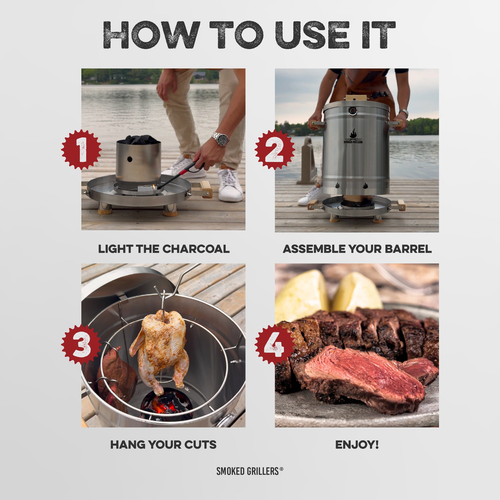 Ideal for: Our medium barrel is the perfect compact grill and smoker. The fits in just about any car, making it ideal for camping, tailgating, or wherever you may want to prepare amazing food. Hang porkbelly, ribs, pichana, Tomahawk, sausages and more.
