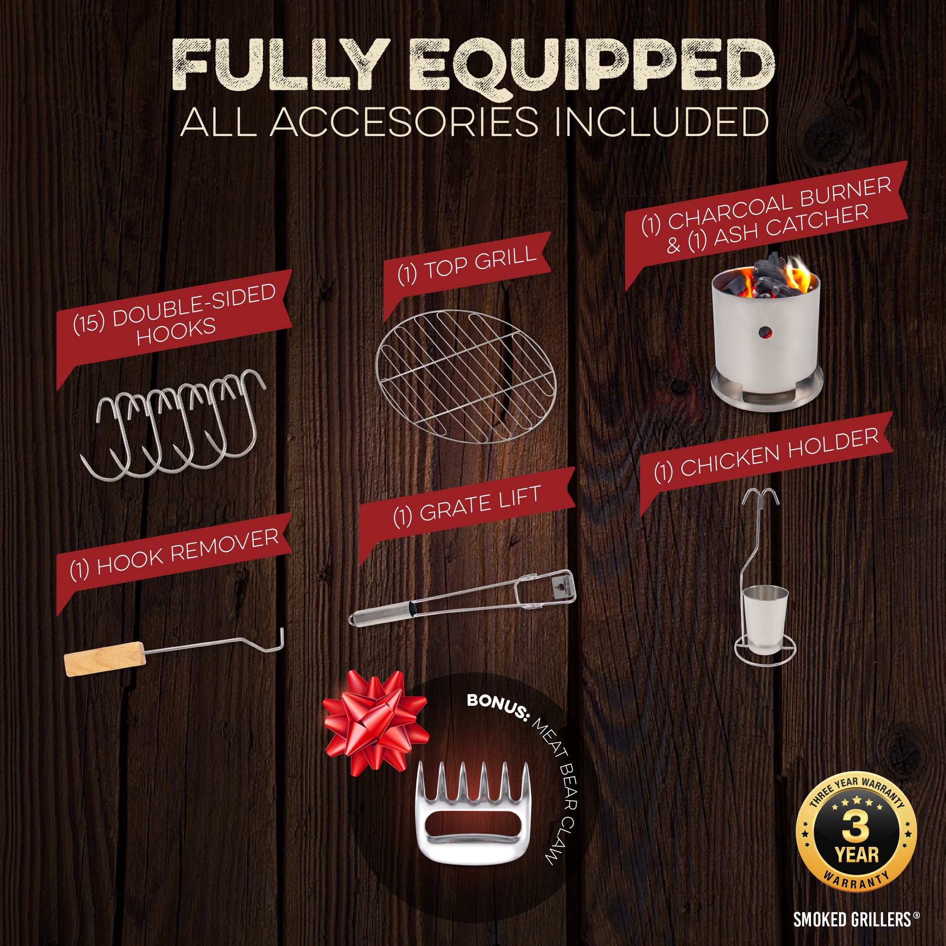 It includes: 12 Hooks, removable top grill, charcoal burner, ash catcher, thermometer and grapple for manipulate the top grill and hooks